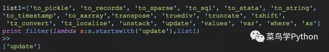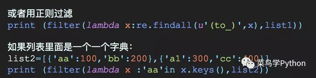 点评:lambda是一个非常简洁的函数表达方式,短小精悍,加上配合filter一起使用,非常漂亮。比如我们通过 字符串里的startswith内置函数,非常方便的过滤出列表里面我们需要的数据!(Python3稍微改一下再filter之外再加一个list,不然生成的是迭代器地址)