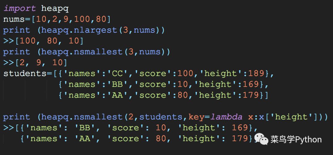 点评:这个heapq库非常好用,尤其是我们在取一些列表的头部数据,比如最大几个,最小几个经常用到,很实用的一招!啥也不说了,赶紧背下来!