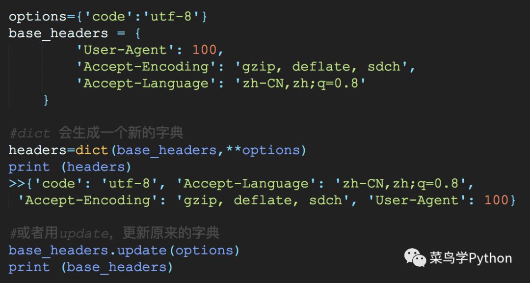 点评:dict.update还是比较平易近人的,这个dict(dict,**options)用法我第一次看到的时候也是楞了一些,什么鬼,现在见多了,也就习惯了!