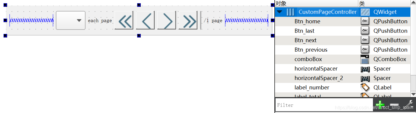 比如我们在用到QTableWidget/QTableView时,经常会有翻页的需求,那么我们可以设计一个页面控制器组件,这里我们采用第2种方式来设计,如下图: