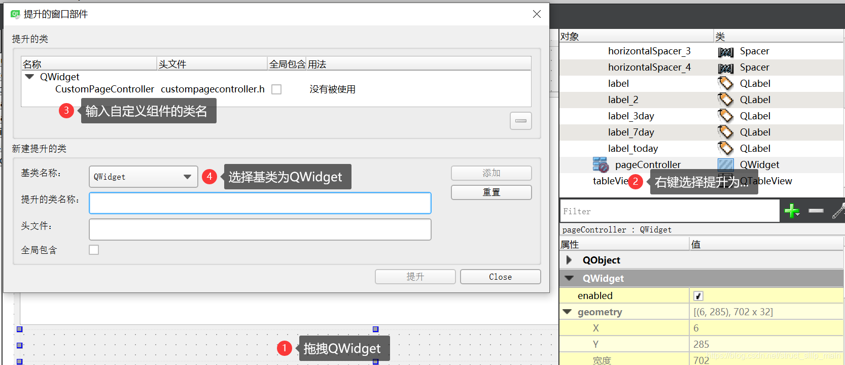 在使用时,将自定义组件的代码文件拷贝的工程中,然后在要使用的界面上拖拽一个QWidget,右键选择提升为,输入自定义组件的类名,选择基类为QWidget;