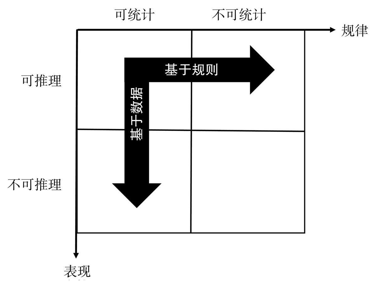 人类的认识的知识可以划分为以下四个象限的知识。基于规则就是人类通过演绎(符号、规则)可以认识的知识,基于数据就是人类可以通过归纳(大数据、统计)可以认识的知识。