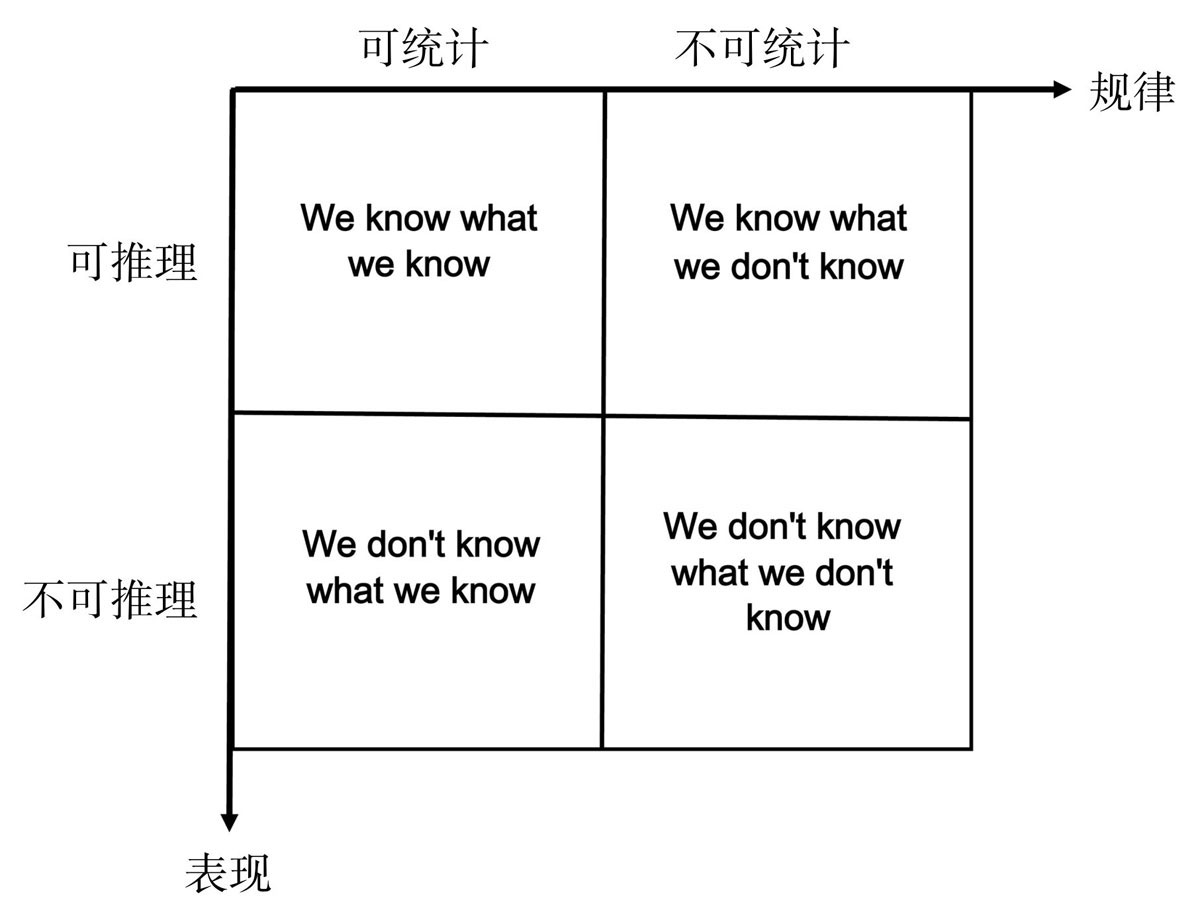- 第四类(We don't know what we don't know):这类问题我们既不知道它蕴含的规律,也没有办法统计出任何有规律的特征。