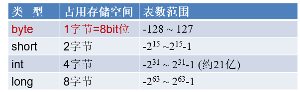 //1.整型:byte(1个字节 = 8bit, 范围:-128 ~ +127) 、 short(2字节) 、 int(4字节) 、 long(8字节)