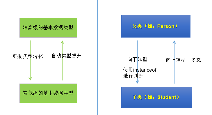 1 //可以考虑将声明为父类引用的子类对象,通过强转符的方式,将父类的引用再转为子类的引用 2 Man m2 = (Man)p2; 3 m2.isSmoking = true; 4 m2.earnMoney(); 5 //强转时,可能出现类型转换异常:ClassCastException 6 // Woman w1 = (Woman)p2; 7 // w1.goShopping(); 8 // w1.isBeauty = true; 9 10 //向下转型 11 //为了避免在强转时出现ClassCastException,我们在强转前,使用instanceof 进行判断即可。 12 /* 13 格式:a instanceof A:判断对象a是否是类型A的一个实例。 14 如果是,返回true。如果不是,返回false。 15 16 补充:如果a instanceof A返回true,则a instanceof B也一定返回true。其中,类型B是类型A的父类。 17 */ 18 Person p3 = new Woman(); 19 if(p3 instanceof Woman){ 20 Woman w2 = (Woman) p3; 21 System.out.println("可以转换为Woman"); 22 } 23 24 if(p3 instanceof Man){ 25 Man m3 = (Man) p3; 26 System.out.println("可以转换为Man"); 27 } 28 29 if(p3 instanceof Person){ 30 System.out.println("person ....."); 31 } 32 if(p3 instanceof Object){ 33 System.out.println("Object..."); 34 }