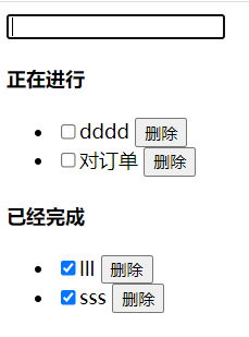 <div id="app"> <input type="text" v-model="todo" @keyup.enter="addData" /><br /> <h4> 正在进行</h4> <ul><li v-for="(item,index) in list" :key="index" v-show="!item.checked"> <input type="checkbox" v-model="item.checked " @change="setTodolist()" />{{item.title}} <button @click="deleteData(index)">删除</button> </li></ul> <h4> 已经完成</h4> <ul> <li v-for="(item,index) in list" :key="index" v-show="item.checked"> <input type="checkbox" v-model="item.checked" @change="setTodolist()" />{{item.title}} <button @click="deleteData(index)">删除</button> </li> </ul> </div> <script type="text/javascript"> var vue = new Vue({ el: "#app", data: { todo: "", list:[] }, methods: { addData: function () { this.list.push({ title: this.todo, checked:false }) this.todo = ""; localStorage.setItem("todolist", JSON.stringify(this.list));//缓存 }, deleteData: function (key) { this.list.splice(key, 1); localStorage.setItem("todolist", JSON.stringify(this.list));//缓存 }, setTodolist: function () { localStorage.setItem("todolist", JSON.stringify(this.list));//缓存 } }, mounted: function () {//表示页面加载的时候触发的方法与methods同级 let todolist = JSON.parse(localStorage.getItem("todolist")); if (todolist) { this.list = todolist; } // alert("aaa") } }) </script>