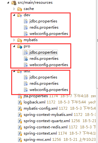 3.在resources里面,分别增加pro,dev,test三个文件夹,然后不同环境需要修改的配置文件放进去里面,如下图所示: