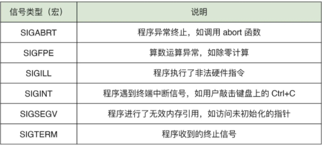 signal 函数用于设置信号对应的处理程序,函数原型为 void (*signal( int sig, void (*handler) (int))) ,其中 sig 是信号类型,handler 是处理程序。信号类型有以下几种: