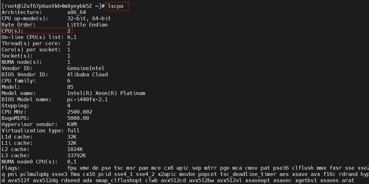 本人为阿里云双核心服务器使用make -j8命令时,CPU升高卡死,系统断开且无法重新连接,最终重启云服务后才恢复,因此后面我使用make -j1进行编译,编译过程持续三四十分钟以上。至于如何查看CPU核心数可以使用lscpu命令,可参考截图,建议任务数一定要小于核心数。