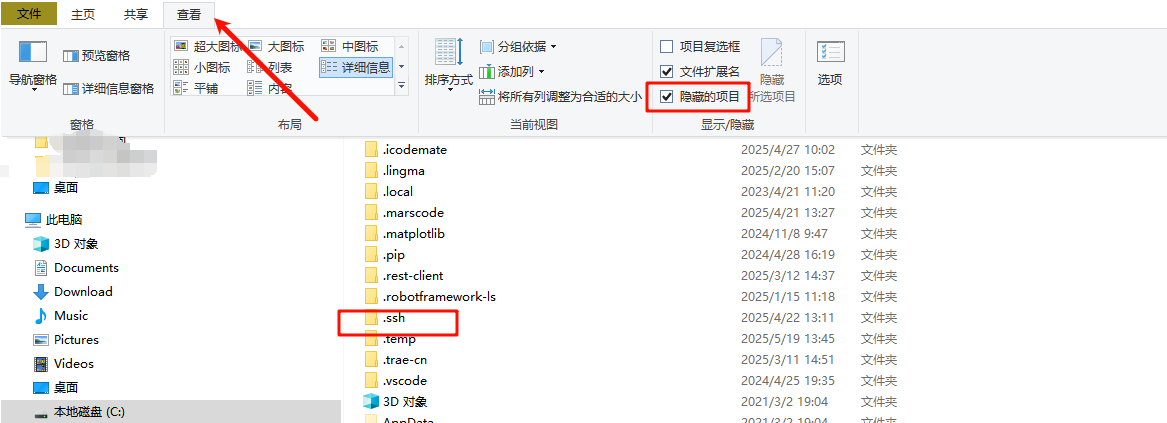 如果看不到.ssh文件夹则需要打开显示隐藏文件win10和win11有不同,以win10为例