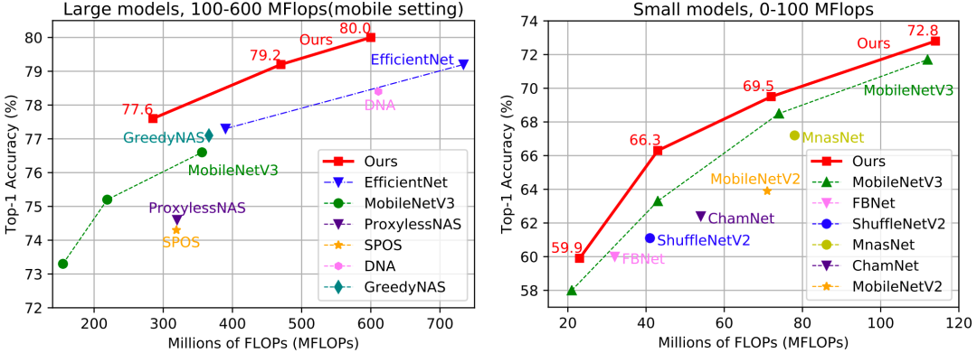 图2:基于优先路径蒸馏的网络结构搜索得到的模型在 ImageNet 上的性能