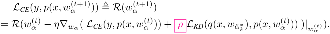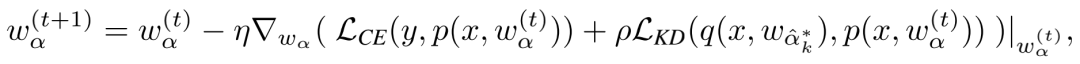 知识蒸馏是一种被广泛应用的模型压缩方法,通过让小型网络来模仿预训练大型网络的最后一层输出特征,可以使小型网络达到接近于大型网络的表现。研究员们通过优先路径来进行蒸馏,从而无需提前训练一个大型神经网络。对超网进行更新的具体公式如下: