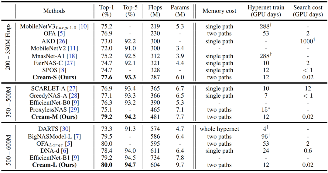 表1:基于优先路径蒸馏的网络结构搜索得到的模型在 ImageNet 上的性能