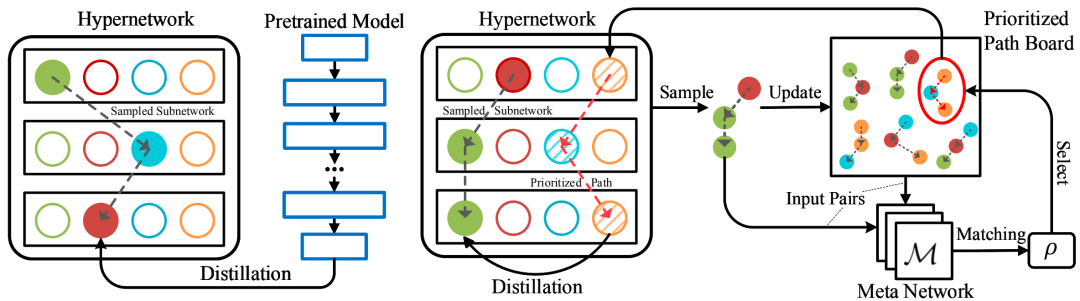 图1:方法示意图,左侧为常规的蒸馏方法,即采用一个预训练的模型进行蒸馏,右侧为提出的基于优先路径的蒸馏方法。
