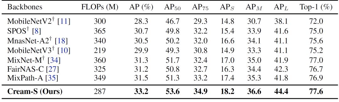 表2:基于优先路径蒸馏的网络结构搜索模型在物体检测任务上的表现