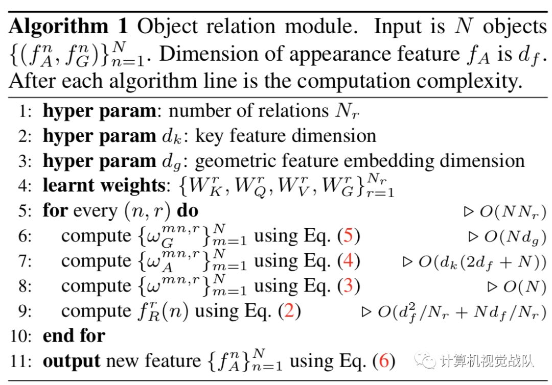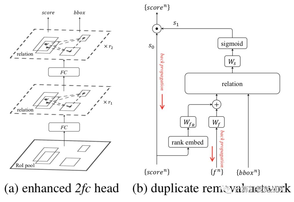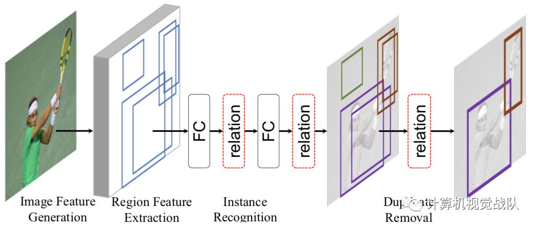 具体的做法借鉴了attention机制(Attention is all you need)的启发,作者提出一个模块:object relation module来描述目标之间的关系,从而以attention的形式附加到原来的特征上,最后进行回归和分类,另外一个亮点是同时将这种attention机制引入NMS操作中,不仅实现了真正意义上的end-to-end训练,而且对于原本的检测网络也有提升。