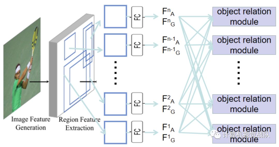 本文使用的是Faster RCNN框架,如下图所示,假设Faster RCNN的RPN模块筛选出N个候选区,在这里就默认每个候选区为一个目标,对每个目标提出其几何特征和形状特征。其中几何特征通过候选区的边框的坐标进行计算,而形状特征的来源为:Faster RCNN提取出候选框后,需要对每个候选框进行ROI pool 然后经过两个全连接层生成最终的目标类别预测,而在这里形状特征即为中间全连接层的输出,为1维向量。然后通过目标关系模块建立任意两个目标之间的关系。