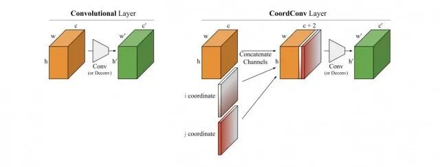 我们知道深度学习里的卷积运算是具有平移不变性的,这样可以在图像的不同位置共享统一的卷积核参数,但是这样卷积学习过程中是不能感知当前特征在图像中的坐标的。CoordConv就是通过在卷积的输入特征图中新增对应的通道来表征特征图像素点的坐标,让卷积学习过程中能够一定程度感知坐标来提升检测精度。