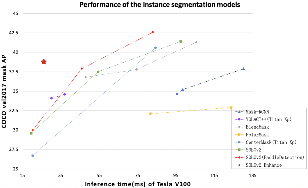 从文章开篇的视频里我们可以看到,算法可以同时检测并精细分割不同快速移动的球员个体。而这个算法,使用的是PaddleDetection研发团队深度优化过的实时实例分割算法SOLOv2。经过一系列的优化后,SOLOv2-Enhance(PaddleDetection提供的SOLOv2的增强模型,如图五角星所示)的性能表现如下图所示: