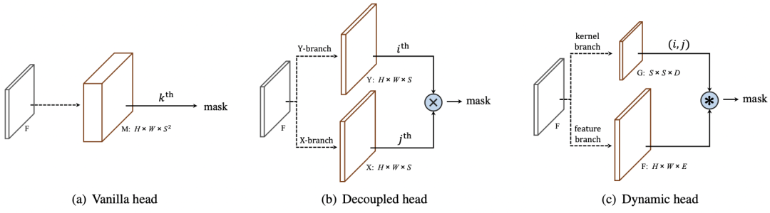 SOLOv2继承了SOLOv1中的一些设定,将原来的mask分支解耦为mask核分支和mask特征分支,分别预测卷积核和卷积特征,如上图(c)中的Dynamic head所示。