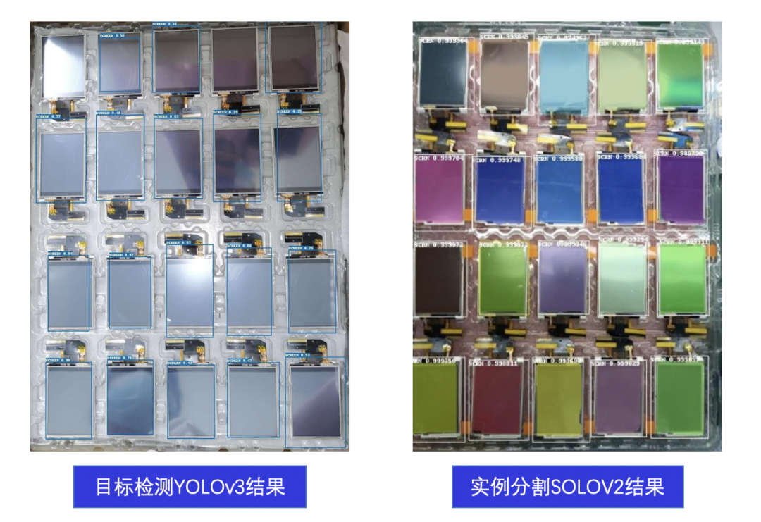 下面是利用机械手吸盘抓取屏幕实现自动化装配的案例图像。我们可以看到,单纯使用目标检测虽然可以得到坐标信息,但对于倾斜的产品的定位却很难做到精确,而使用SOLOV2实例分割,是可以精确的得到目标的轮廓信息。