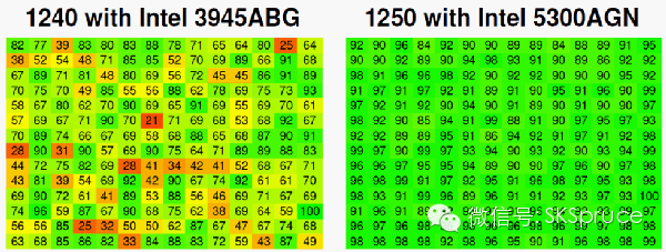 于部署的效果进行评价,防止由于多径干扰出现死角。下图就是用11g部署和11n网络部署后整片区域的差异。红色区域表示覆盖不理想的情况,可以看出
