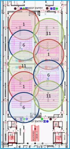 根据如上两点可以算出每个区域的带宽需求,下一步就是AP规划。 虽然11g号称54Mbps带宽,实际可用的最多只有25Mbps,也就是说最多能保证50个设备同时浏览网页(在这个情况下由于客户端相互竞争,用户体 验已经非常糟糕了,一般打个对折)。11n对于大部分手机只能保证35Mbps,对于笔记本电脑等支持MIMO的可以保证到70Mbps甚至更高。按照这 个原则相应地在图上标出每个AP应该覆盖的区域。为了保证通信质量,为了保证比较好的体验,实际上应该控制每个AP接入的设备不超过刚才计算出的数目的一 半。