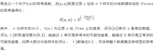 iTree 构造完成后,接下来对数据进行预测。预测的过程就是把测试记录从 iTree 根结点开始搜索,确定测试记录落在哪个叶子节点上。iTree 能检测异常的假设是:异常点一般都是非常稀有的,在 iTree 中很快会被分到叶子节点上。也就是说,在 iTree 中,异常值一般表现为叶子节点到根节点的路径 h(x) 很短。因此,可以用 h(x) 来判断一条记录是否属于异常值。