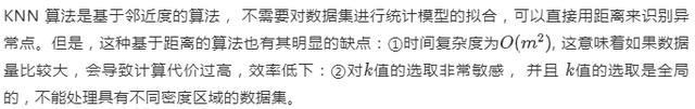 综上所述,两种基于统计模型的异常点检测方法,需要建立在标准的统计学技术(如分布 参数的估计)之上。这类方法对于低维数据效果可能较好,但是对于高维数据,数据分布非常 复杂,基于统计模型的检测效果会比较差。