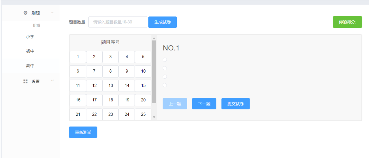输入题目数量后就可以生成试卷,然后还支持上一题,下一题,重新测试,以及左侧题目序号导航等功能