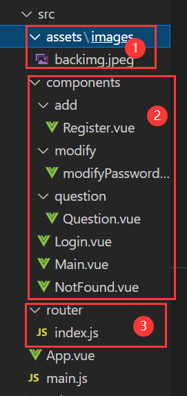 3、前端结构如下,主要分为资源、页面、路由、配置等部分