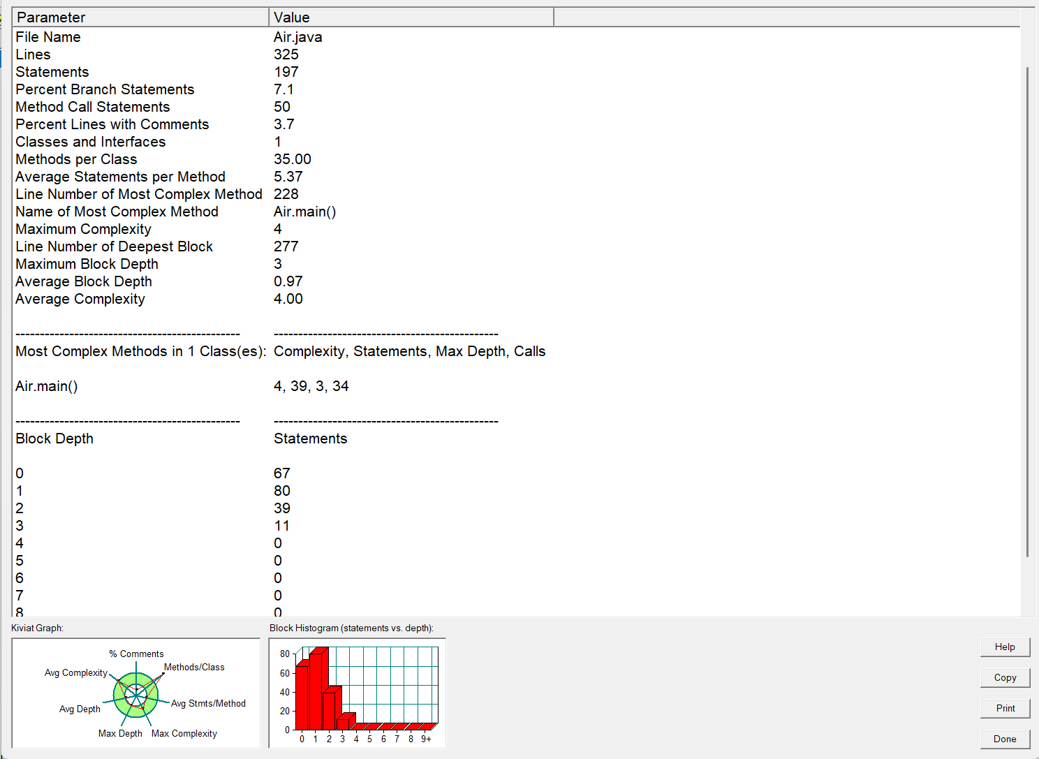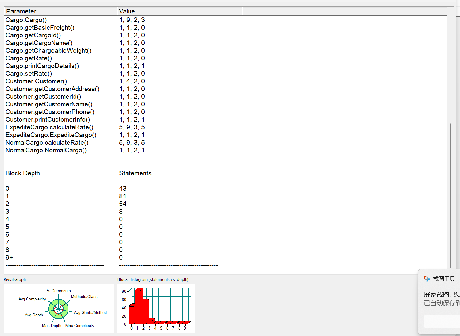 (2)代码块深度:最大代码块深度为 3 ,平均深度 0.97 。最大深度表明代码中最深的嵌套层次为 3 层,不算太深;平均深度低说明整体代码嵌套情况不严重,代码结构较为扁平,利于理解和修改 。