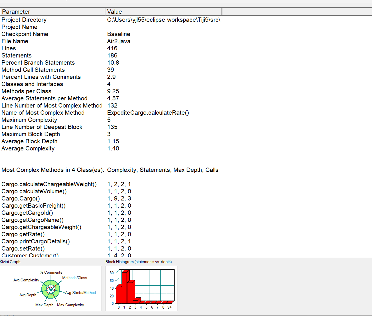 最复杂方法情况:列出了多个类中较复杂方法及其圈复杂度、语句数、最大深度和方法调用数等信息。如ExpediteCargo.calculateRate()方法圈复杂度为 5 ,语句数 9 ,最大深度 3 ,方法调用数 5 ,说明该方法逻辑相对复杂,后续维护或修改时需重点关注 。