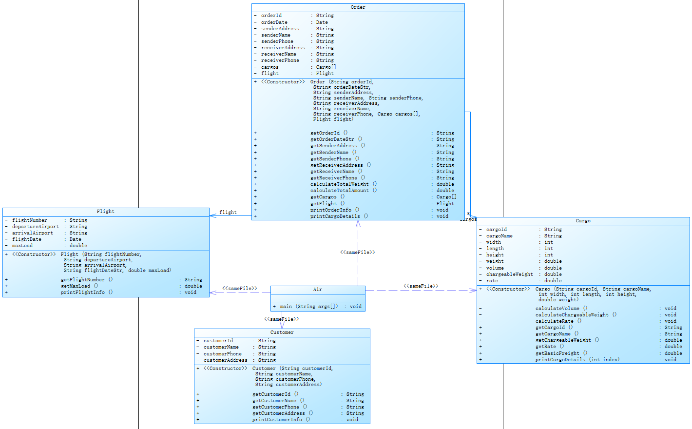 (1)通过定义Flight、Order、Cargo、Customer等类,将现实业务中的实体抽象为代码中的对象,理解如何用属性描述事物状态(如航班号、货物重量),用方法封装行为逻辑(如计算计费重量、打印订单信息)。