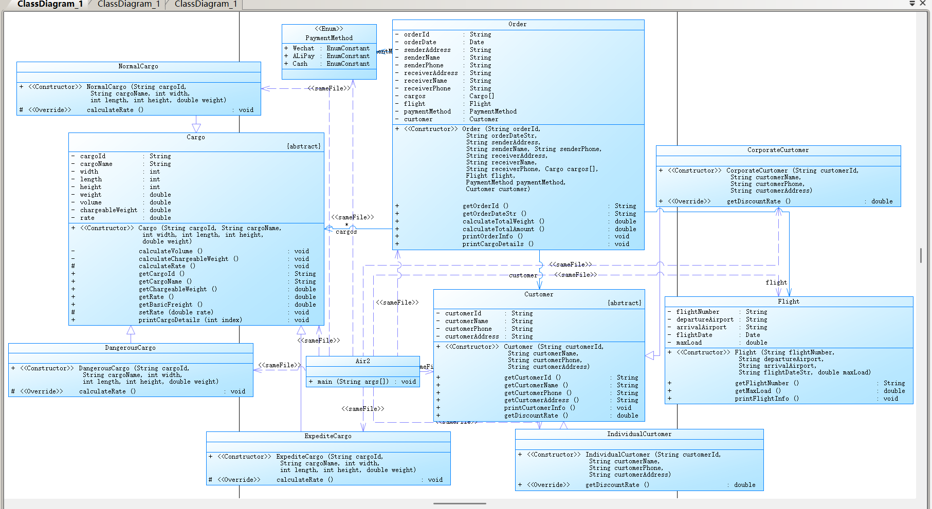 通过抽象类Customer和Cargo实现开闭原则,新增客户 / 货物类型时无需修改原有代码;Order类组合Flight、Customer等对象,实践了合成复用原则,避免继承带来的强耦合。