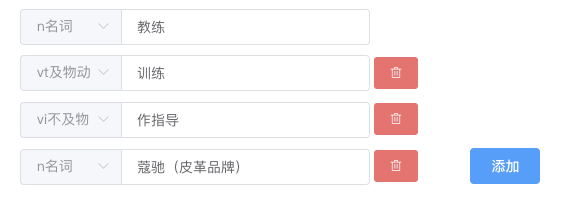 1 <el-col v-for="(item, index) in wordData.translation" :key="index" :span="23" style="margin-bottom: 10px;"> 2 <el-input v-model="item.means" placeholder="请输入释义" class="input-with-select" style="width: 350px;"> 3 <el-select slot="prepend" v-model="item.part" placeholder="词性" style="width: 100px;"> 4 <el-option 5 v-for="item in partList" 6 :key="item.type" 7 :label="item.name" 8 :value="item.type" 9 /> 10 </el-select> 11 </el-input> 12 <el-button v-if="index>0" type="danger" size="small" icon="el-icon-delete" @click.prevent="removeTrans(index)" /> 13 </el-col>