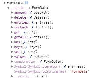 //添加数据 formData.append("k1", "v1"); //获取数据 formData.get("k1"); // "v1" //判断有没有数据 formData.has("k1"); // true //删除数据 formData.delete("k1");