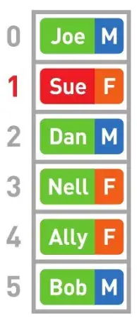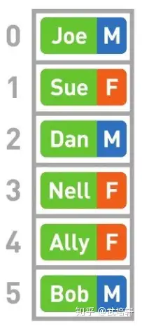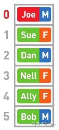 因此,我们将 Joe 的数据存进数组的 3 号箱子中,重复前面的操作,将其他数据也存进数组中。