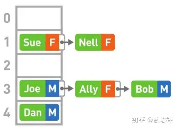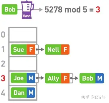 Bob 键的哈希值为 5278, mod 5 的结果为 3,本应将其存储在数组的 3 号箱中,但 3 号箱中已经有了 Joe 和 Ally 的数据,所以使用链表,在 Ally 的后面继续存储 Bob 的数据。