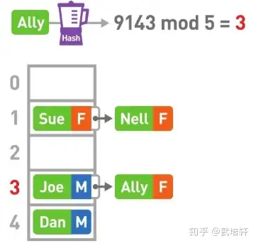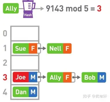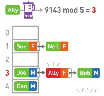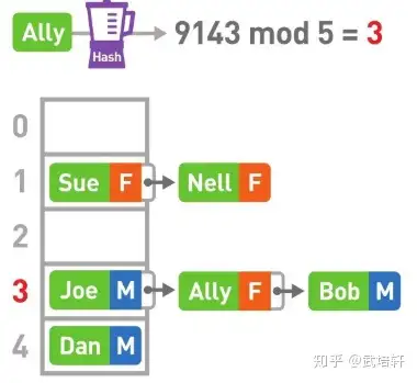 Ally 键的哈希值为 9143, mod 5 的结果为 3,本应将其存储在数组的 3 号箱中,但 3 号箱中已经有了 Joe 的数据,所以使用链表,在其后面存储 Ally 的数据。