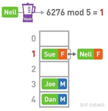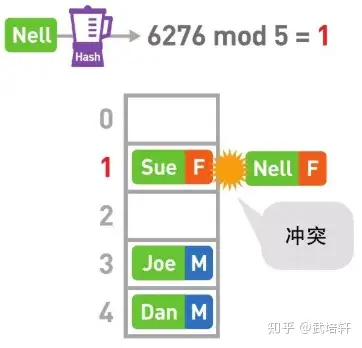 Nell 键的哈希值为 6276, mod 5 的结果为 1,本应将其存进数组的 1 号箱中,但此时 1 号箱中已经存储了 Sue 的数据,这种存储位置重复了的情况便叫作冲突。