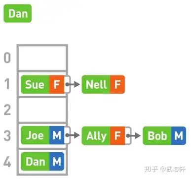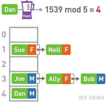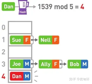 Dan 键的哈希值为 1539, mod 5 的结果为 4,将 Dan 的数据存进 4 号箱中。