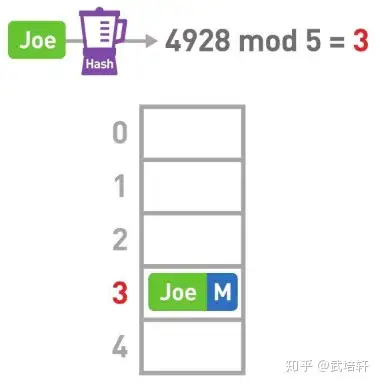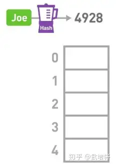 尝试把 Joe 存进去,使用哈希函数(Hash)计算 Joe 的键,也就是字符串 Joe 的哈希值,比如得到的结果为4928。