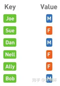 哈希表存储的是由键(key)和值(value)组成的数据。 例如,我们将每个人的性别作为数据进行存储,键为人名,值为对应的性别,其中 M 表示性别为男,F 表示性别为女。