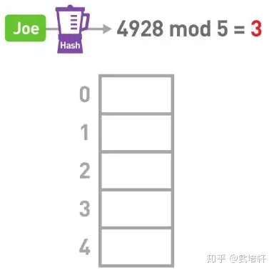 将得到的哈希值除以数组的长度 5,求得其余数,这样的求余运算叫作mod运算,此处mod运算的结果为3。