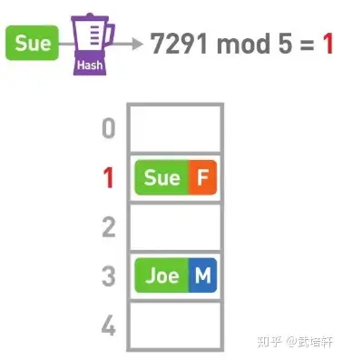 Sue 键的哈希值为 7291, mod 5 的结果为 1,将 Sue 的数据存进 1 号箱中。