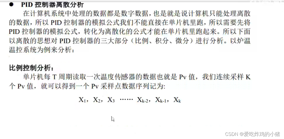 我们在单片机中不可能实现连续的控制(不可能说全部的时间都去进行PID控制,否则就进入了死循环,不能进行其他的操作),所以说这里在使用的是PID控制器离散型分析,顾名思义就是说我们获取的数据不是连续的,而是每隔相同的时间进行获取(这个和我们单片机的中断相吻合)