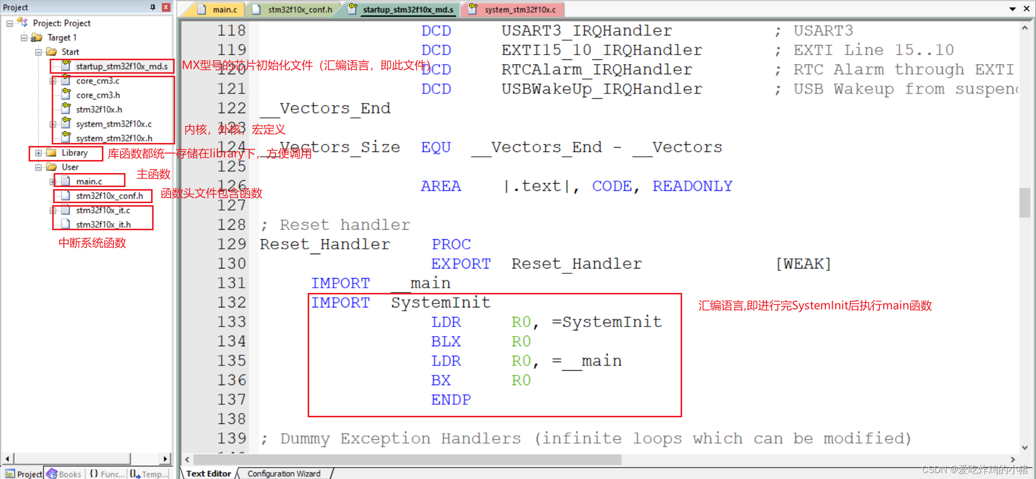 Start:定义的内容也是从固件库直接对芯片进行初始化操作,