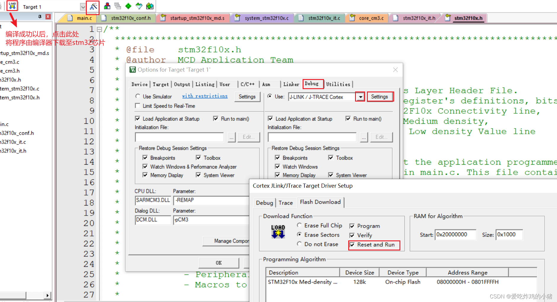 6,工程选项,Debug,下拉列表选择对应调试器,Settings,Flash Download里勾选Reset and Run