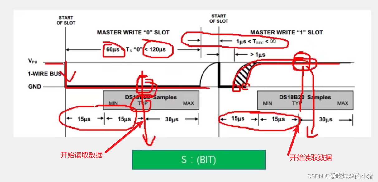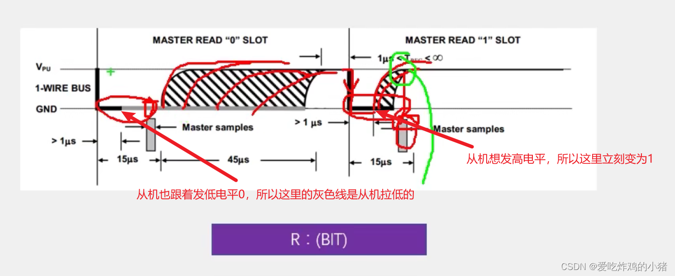 从机将在总线拉低30us后(典型值)读取电平,整个时间片应大于60us